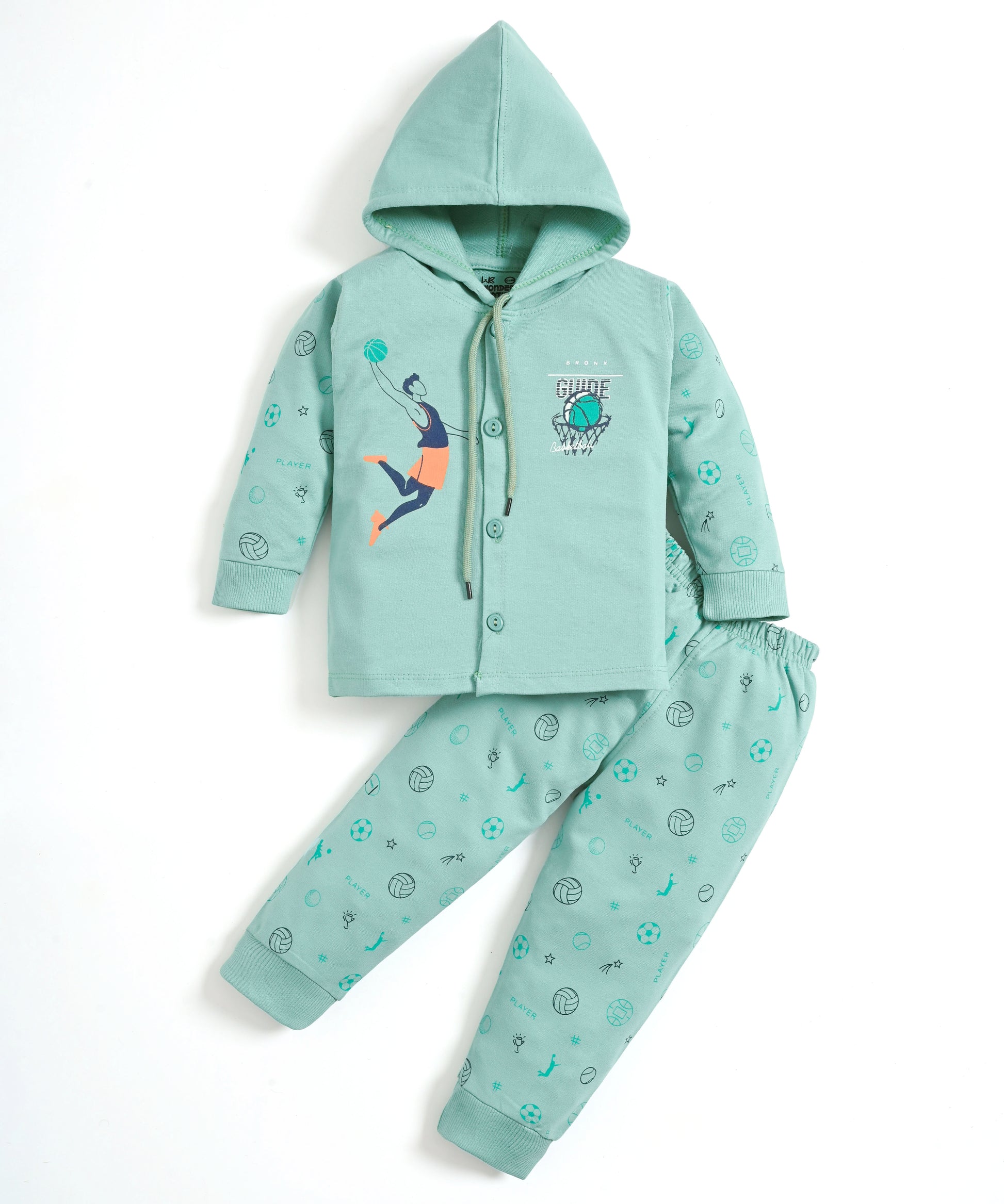 Slam dunk your kiddo's wardrobe with the Basketball Full Sleeves Front Open Hooded Sweatshirt & Joggers Set! This front-open hooded set is seriously next-level. Itβs got a cool basketball player graphic on the chest and an all-over print featuring balls and sports iconsβtotal MVP energy!