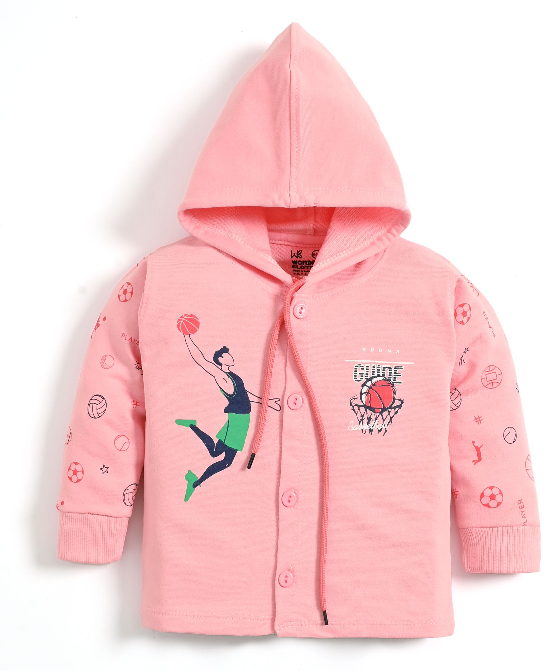 Slam dunk your kiddo's wardrobe with the Basketball Full Sleeves Front Open Hooded Sweatshirt & Joggers Set! This front-open hooded set is seriously next-level. Itβs got a cool basketball player graphic on the chest and an all-over print featuring balls and sports iconsβtotal MVP energy!