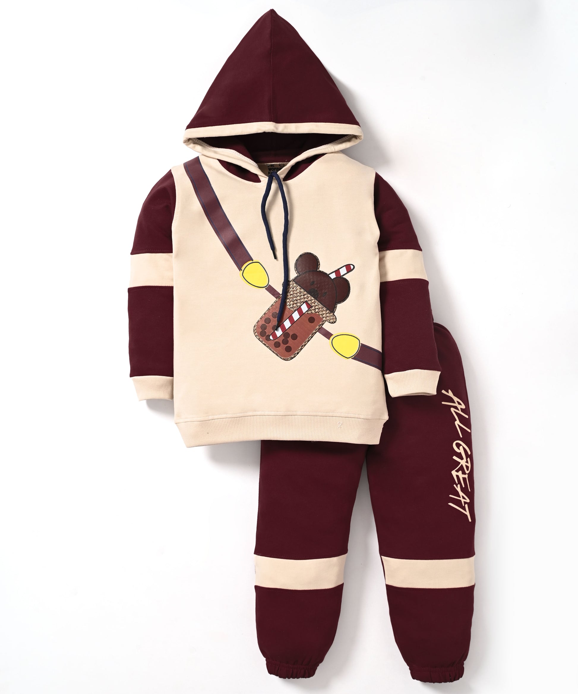 Bundle up your little ones in pure joy! Our newest arrival is here to redefine winter clothes for kids with a dash of fun. This adorable kids winter wear set features a super-cute bear sipping bubble tea graphic that creates an instant smile. Designed for maximum snuggle-factor, it boasts a cosy Hood with Drawstring and Full Sleeves with Ribbed Cuffs to keep the chilly breeze out.