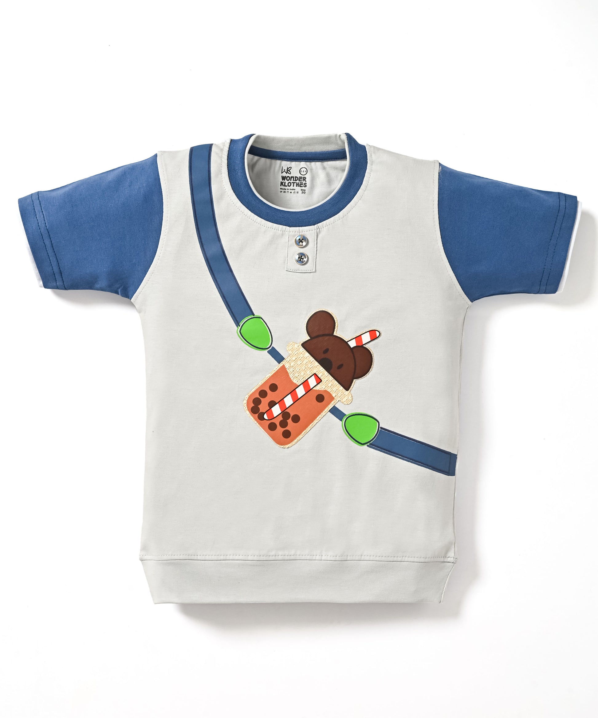 Get your little adventurer ready for heaps of fun with our adorable kids t shirt set of boys! This outfit is pure joy, featuring a playful graphic of a cuddly bear sipping boba tea, cleverly designed with a printed crossbody strap. It is the perfect pick when you are looking for stylish kids dress boys options that sparkle with personality.