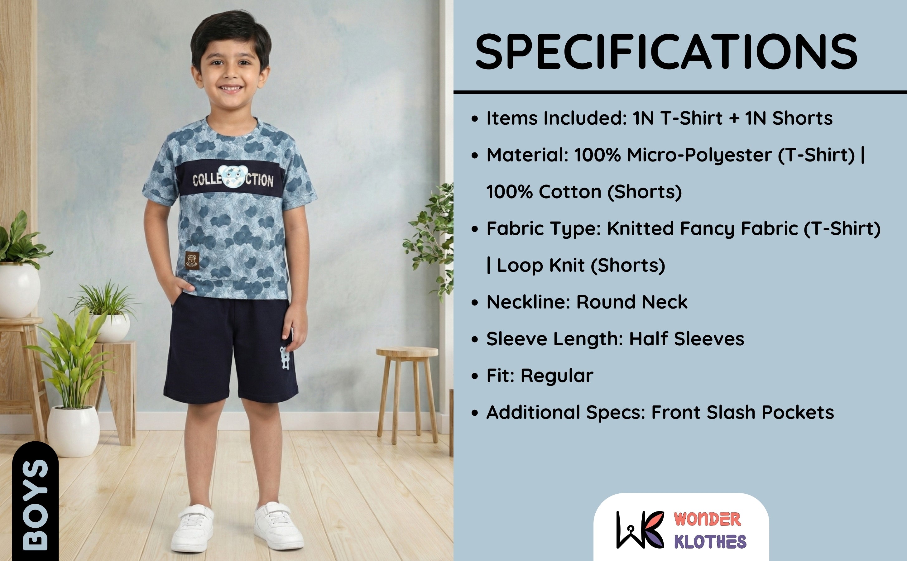 This set features a classic round neck and breezy half sleeves, making it a standout choice in kids wear boys. The matching shorts are just as brilliant, boasting handy front slash pockets for storing little treasures and a premium elastic waistband with bow detail for the perfect, snug fit. If you are hunting for a trendy kids boy dress that mixes style with ease, this is it!