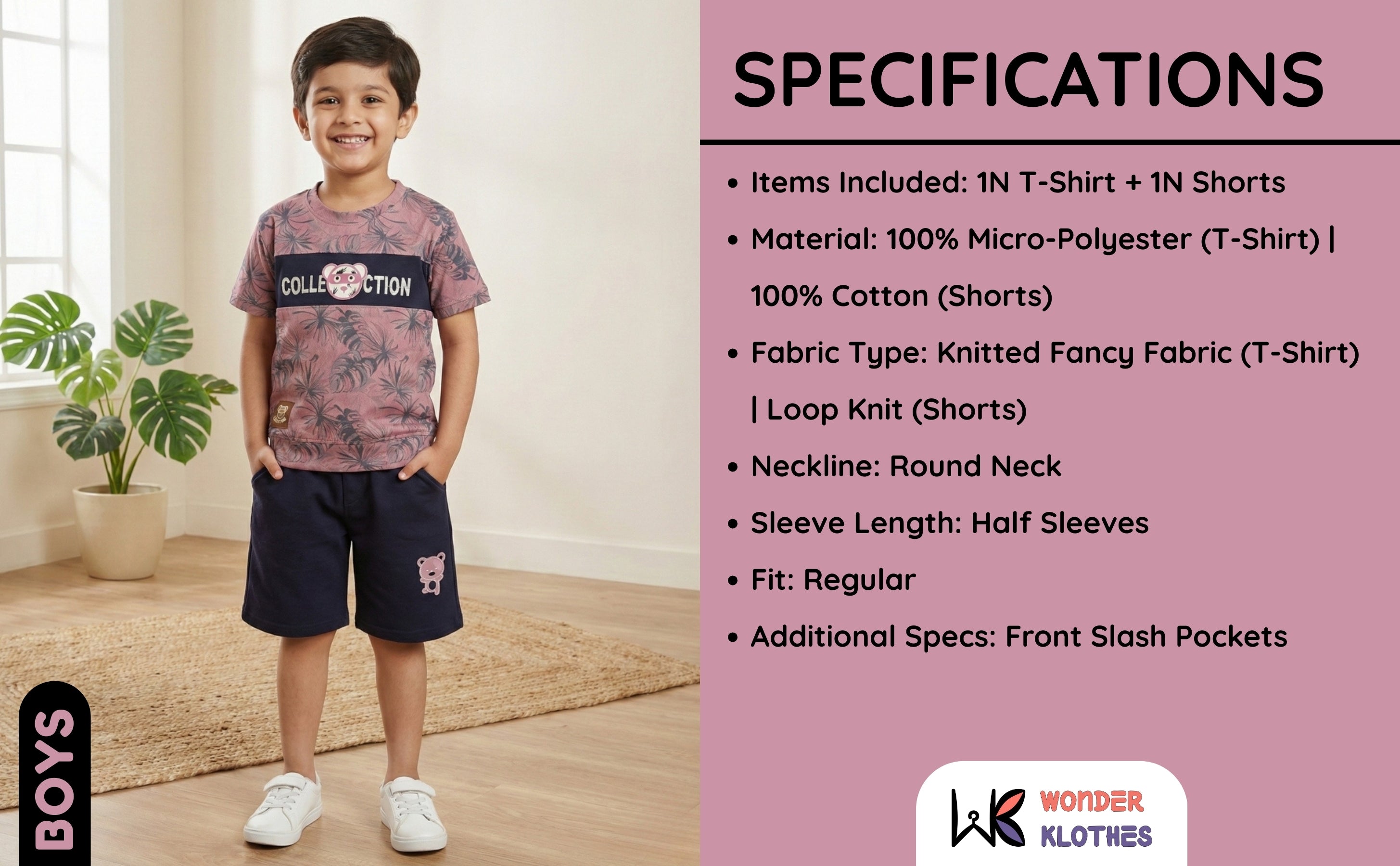 This set features a classic round neck and breezy half sleeves, making it a standout choice in kids wear boys. The matching shorts are just as brilliant, boasting handy front slash pockets for storing little treasures and a premium elastic waistband with bow detail for the perfect, snug fit. If you are hunting for a trendy kids boy dress that mixes style with ease, this is it!