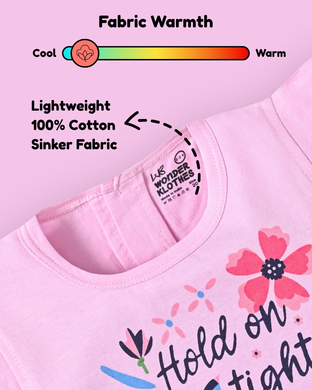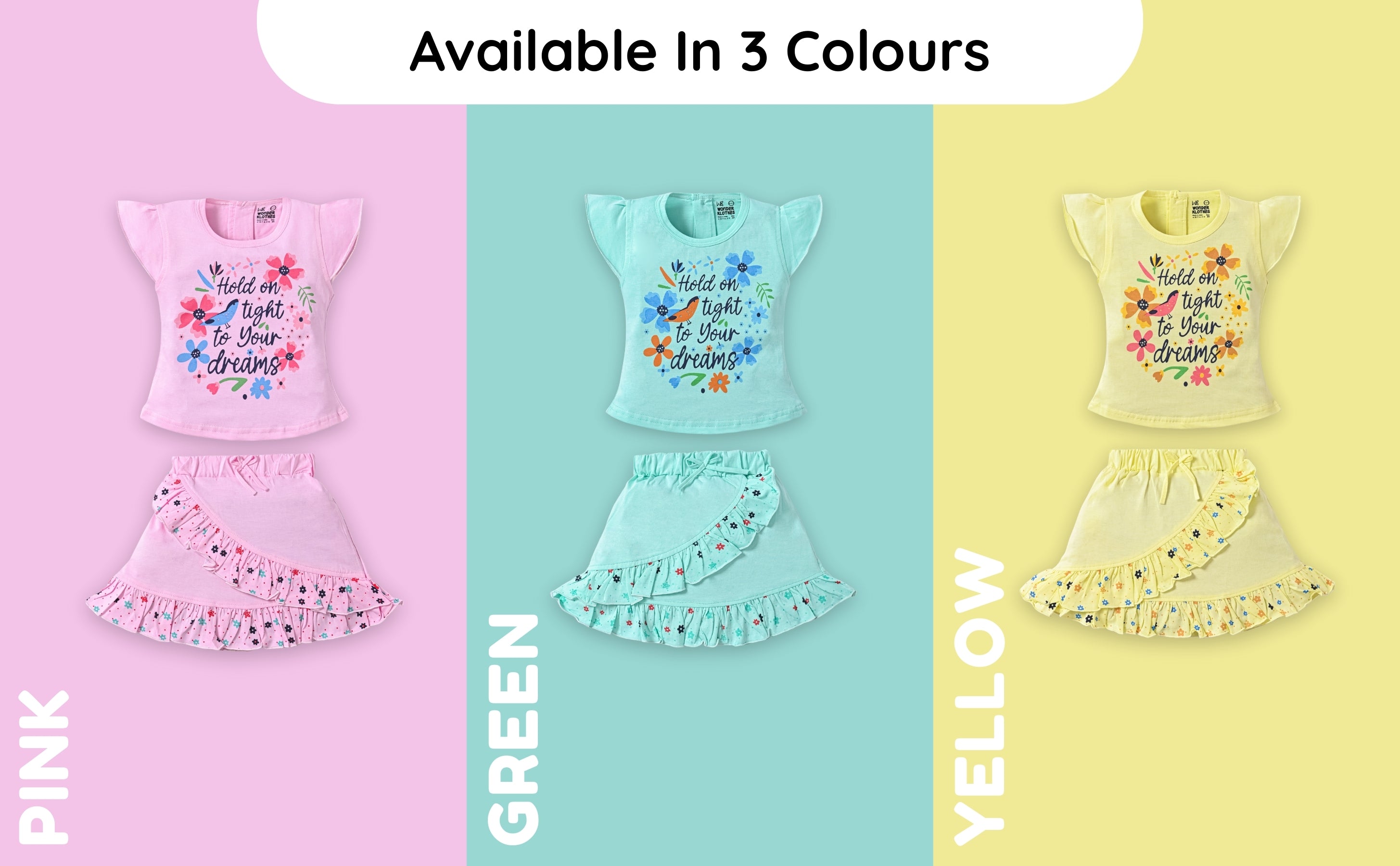 Get ready to upgrade her wardrobe with this joyful set that screams fun. Featuring an inspiring print in top, this set is a fantastic alternative to a standard baby girl dress. Crafted from premium clothing standards using lightweight 100% Cotton Sinker Fabric, this kids dress combo ensures she stays cool and comfy on even the warmest days.