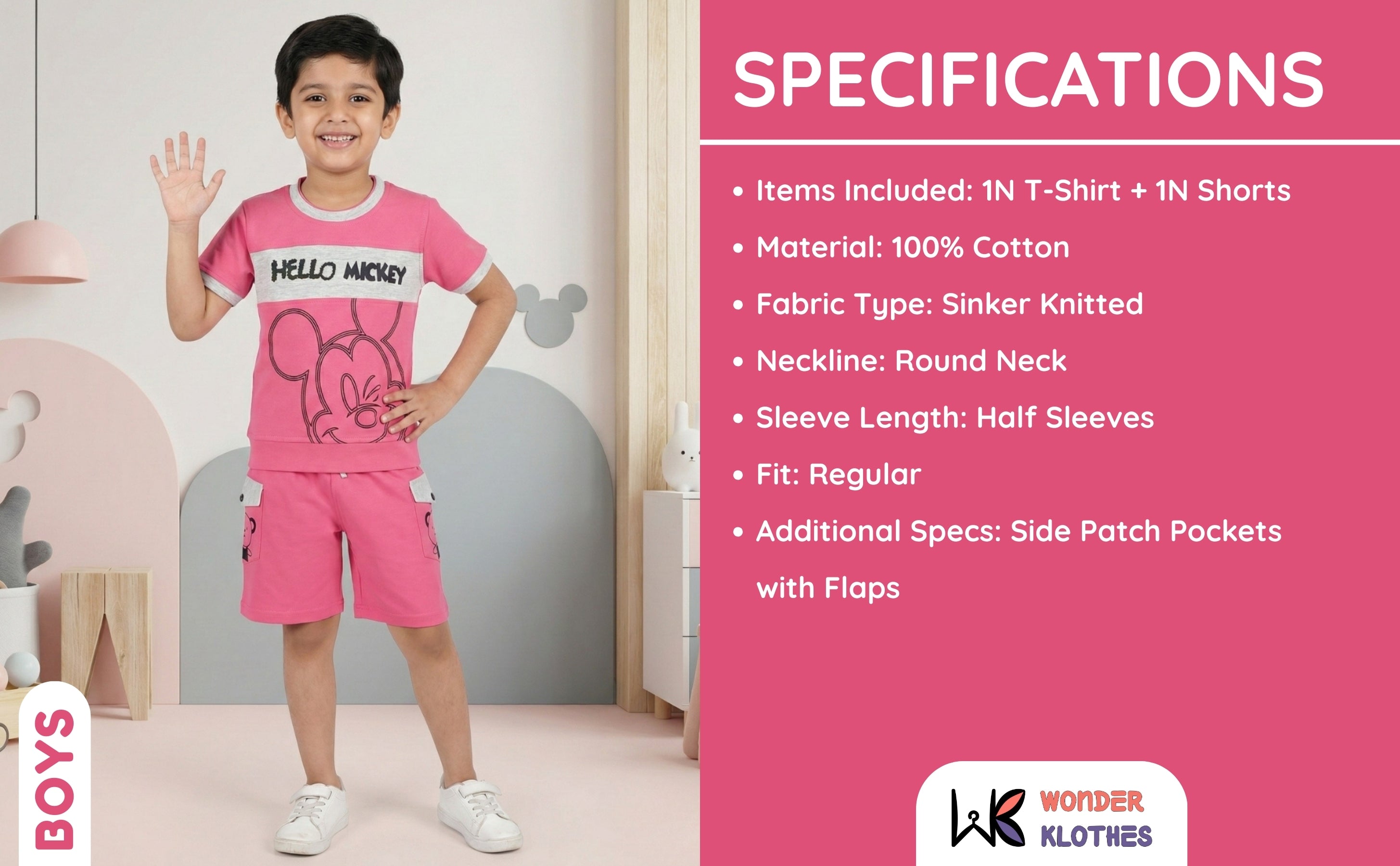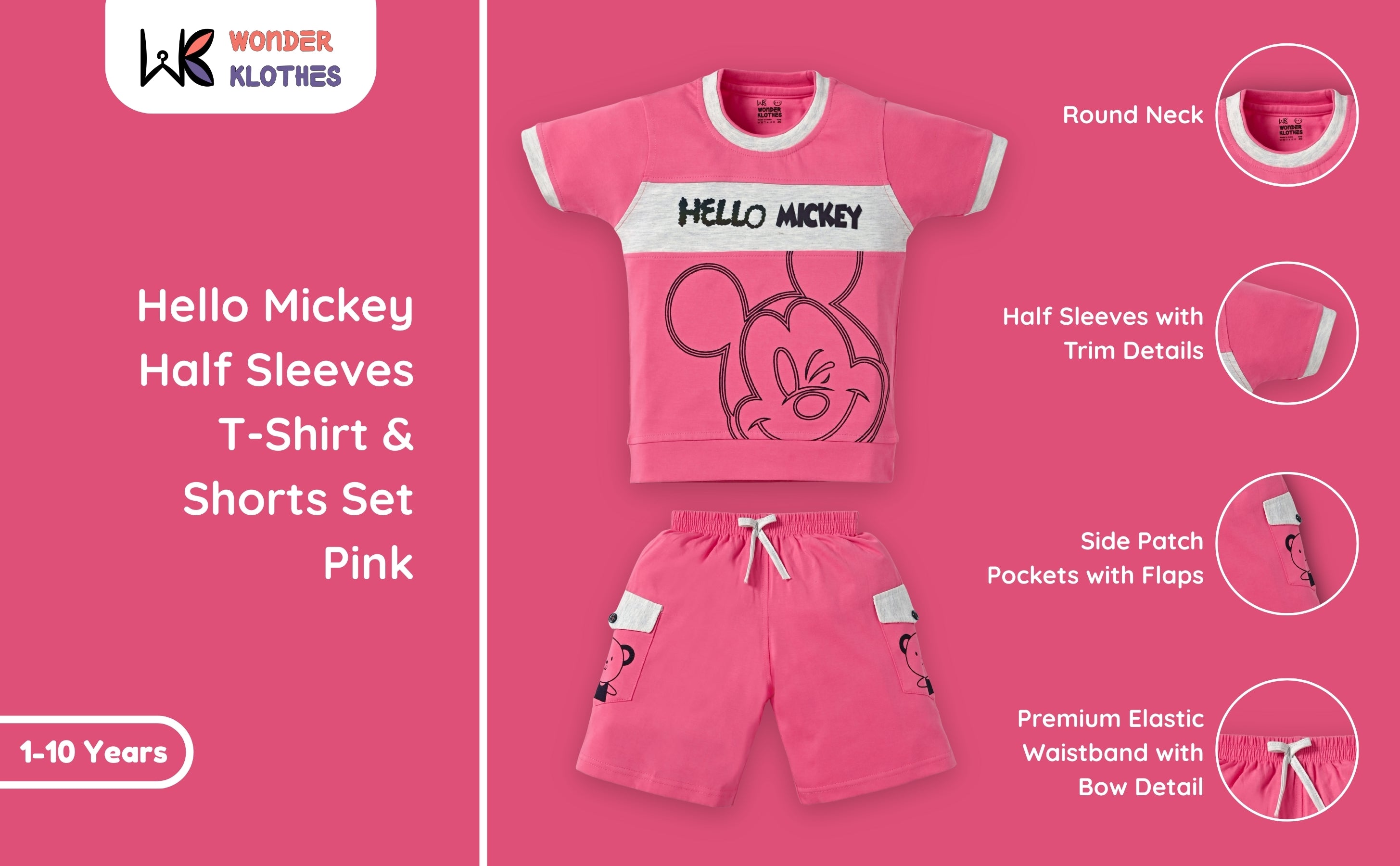 Hello Mickey Half Sleeves T-Shirt & Shorts Set | Pink