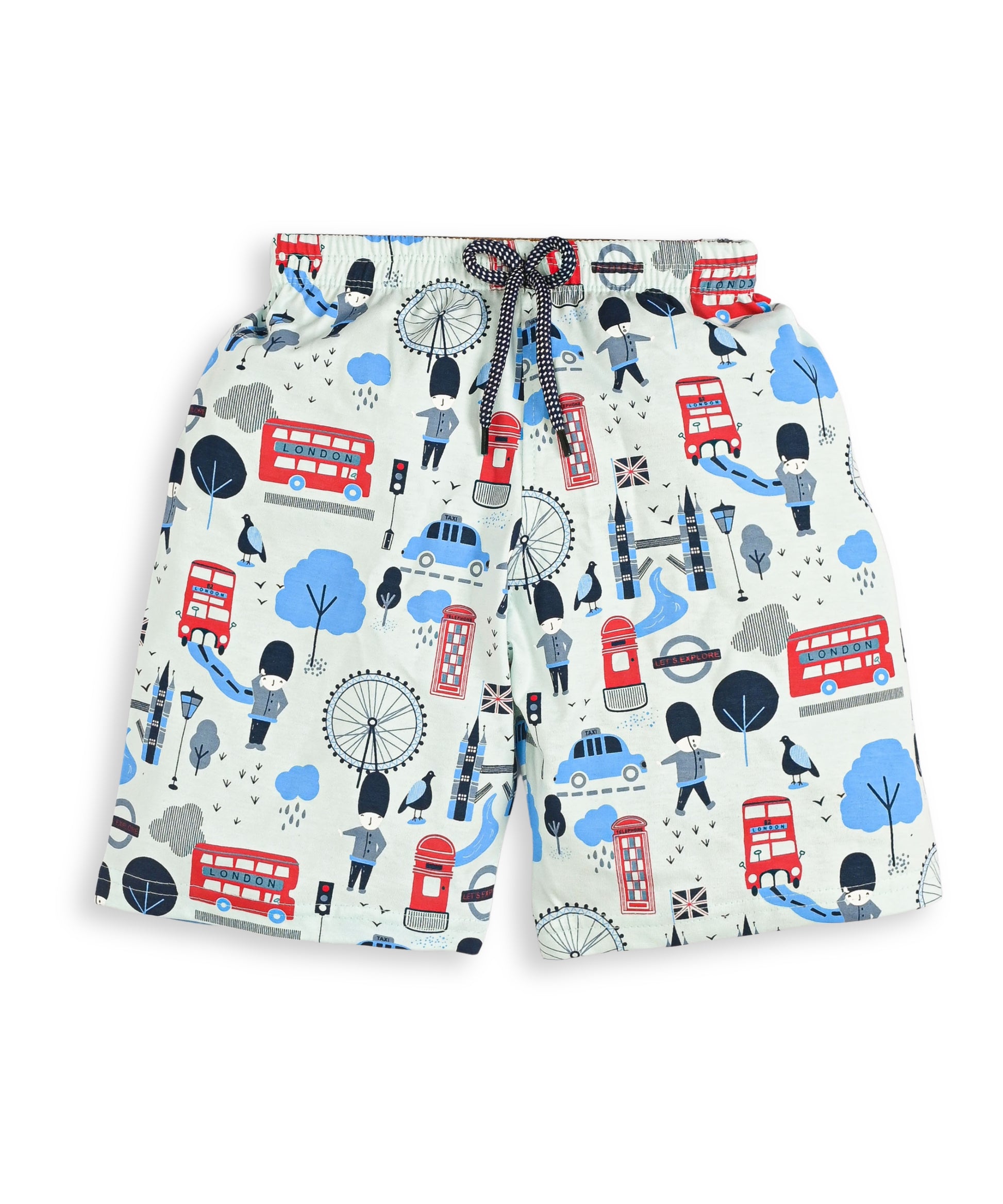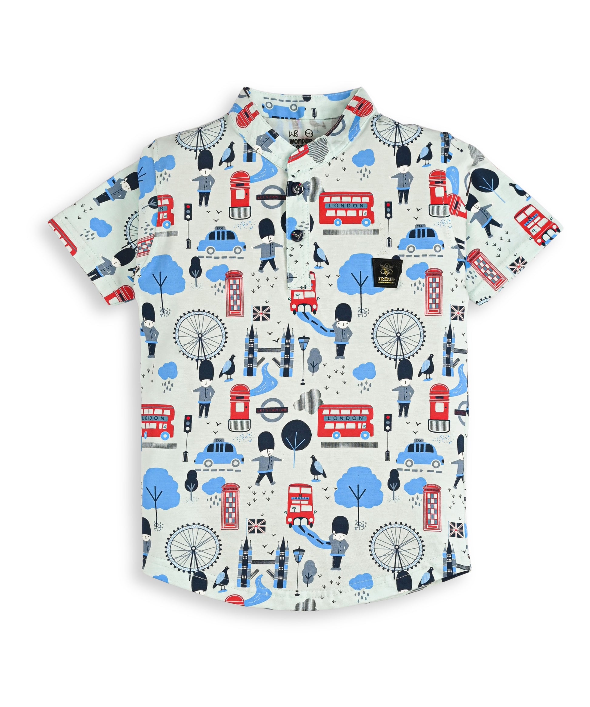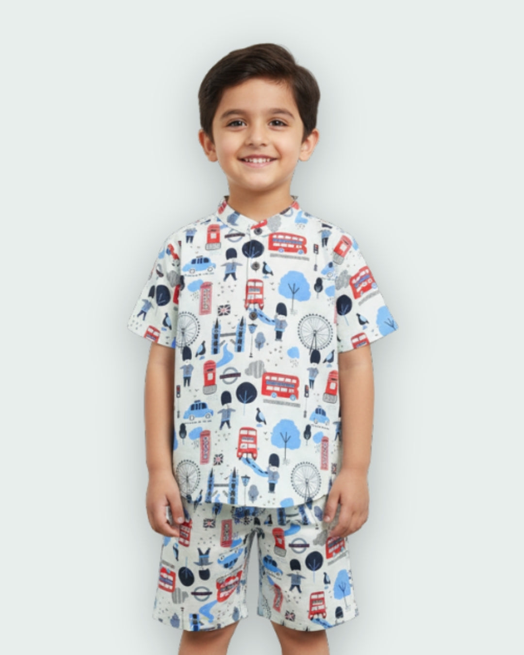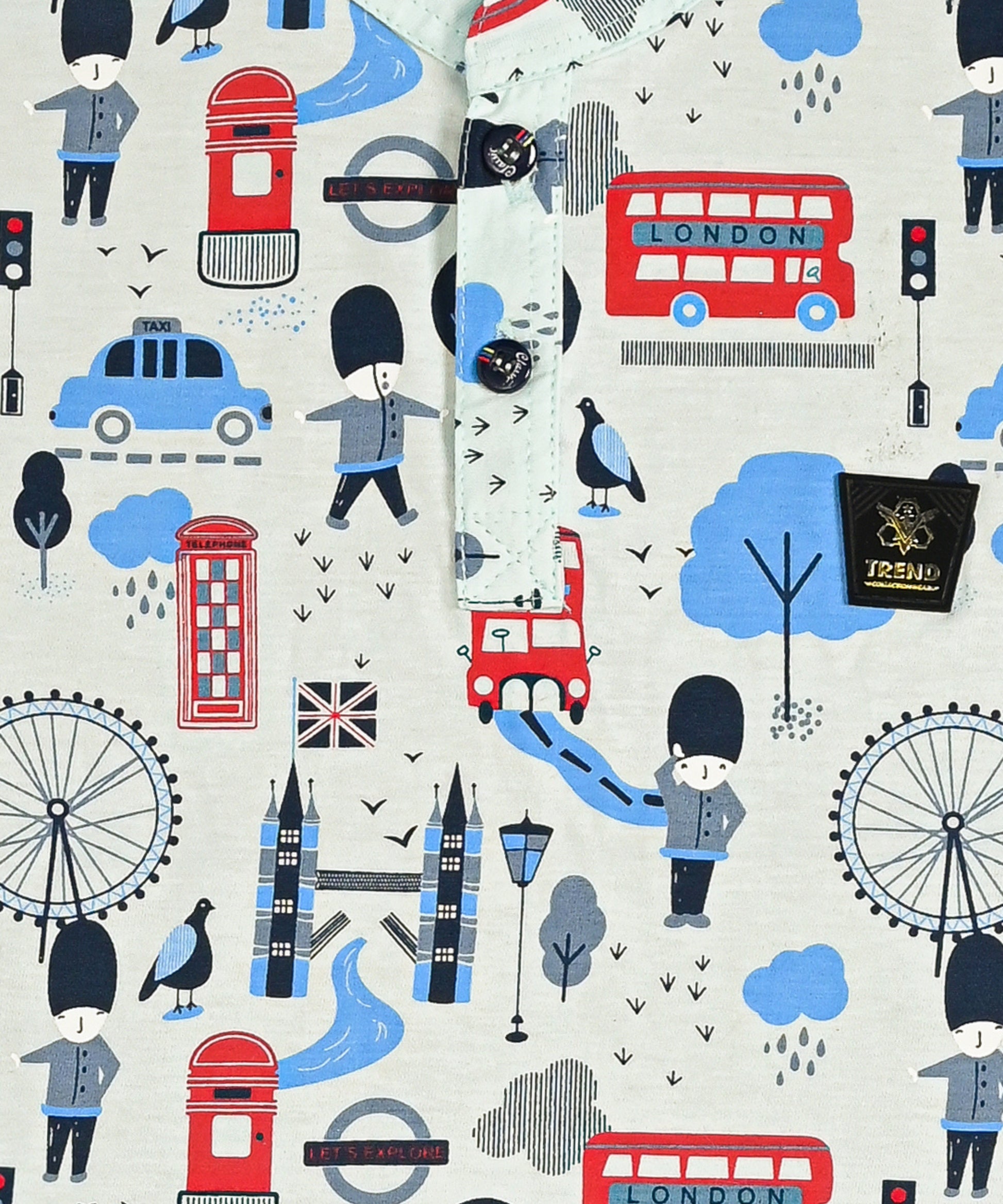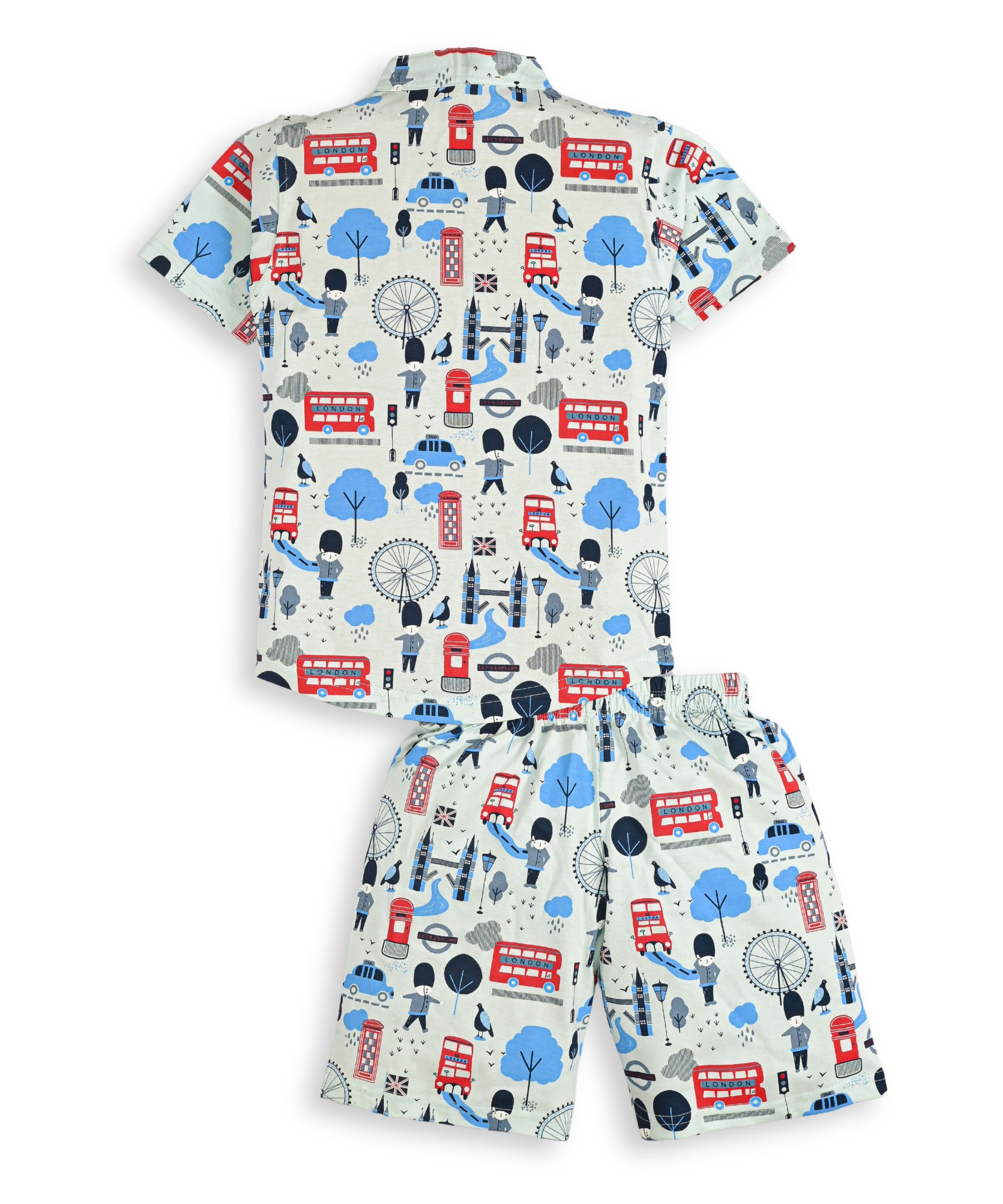 Celebrate London in style with this playful clothing set made from soft cotton. It features a half-sleeve t-shirt and shorts crafted from sinker knitted fabric for ultimate comfort. The T-shirt sports a band collar with buttons and an all-over rotary print, adding a stylish twist to a casual look. Featuring fun London city icons, this set brings a classy vibe to your child's casual wardrobe while keeping your little one's comfy all day long. Perfect for little explorers with a big imagination!