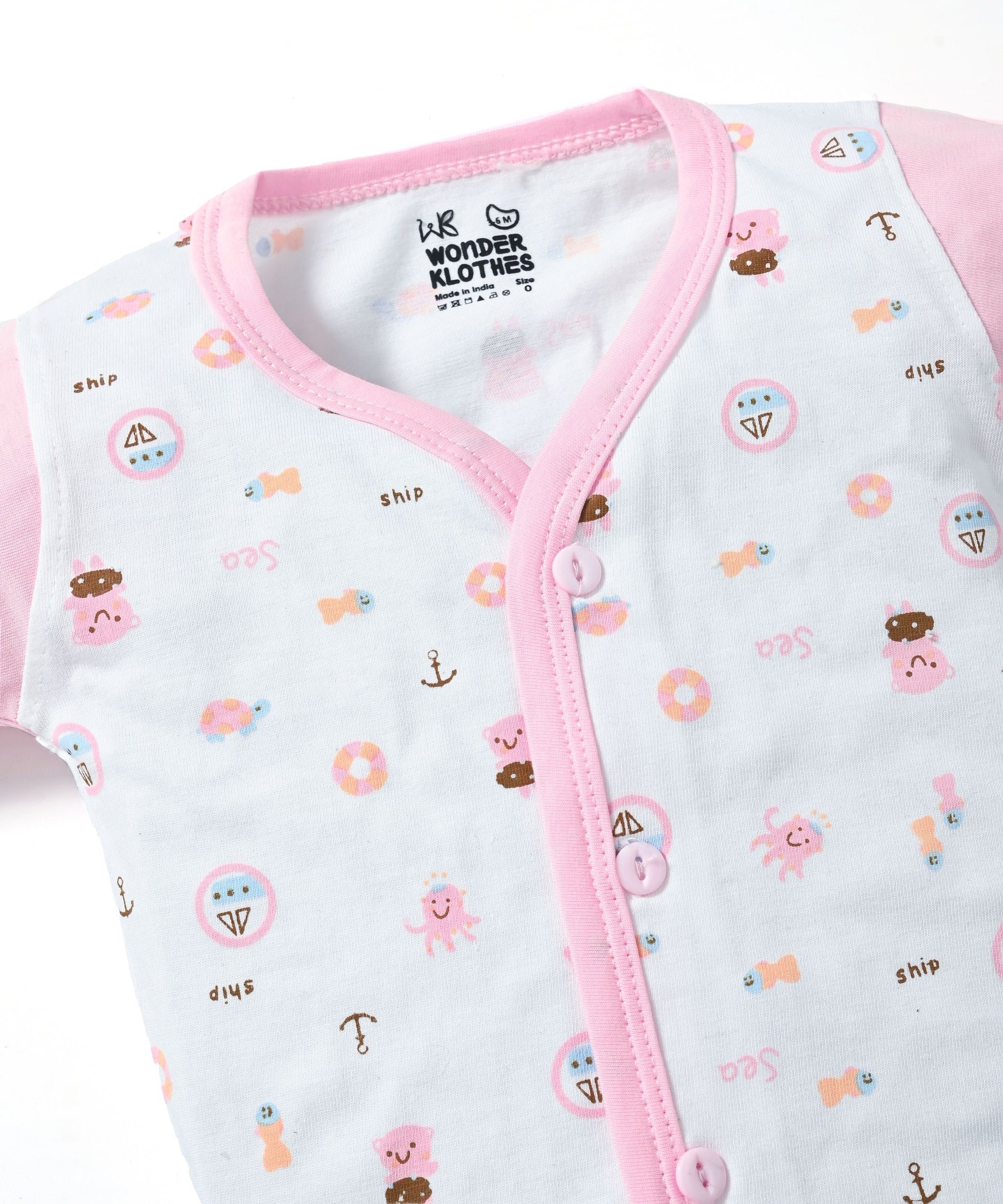 Sea Ship Full Sleeves Front Open T-Shirt & Pyjama Set with Bib | Pink