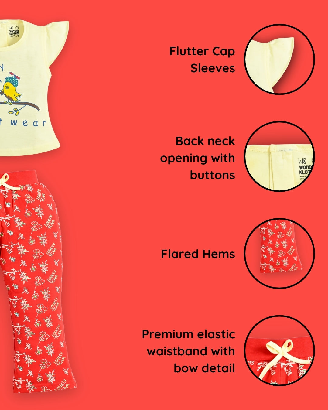 OMG, you need this! Introducing the adorable Sweet Bird Short Sleeves Top & Bootcut Pant Set—the perfect chill outfit for your little one. The top features flutter sleeves and the cutest "LOVELY TEAM, SWEET WEAR" graphic with a sweet bird perched on a branch. The comfy bootcut pants are decked out in a fun all-over print with bows and the text "LOVELY TEAM"!