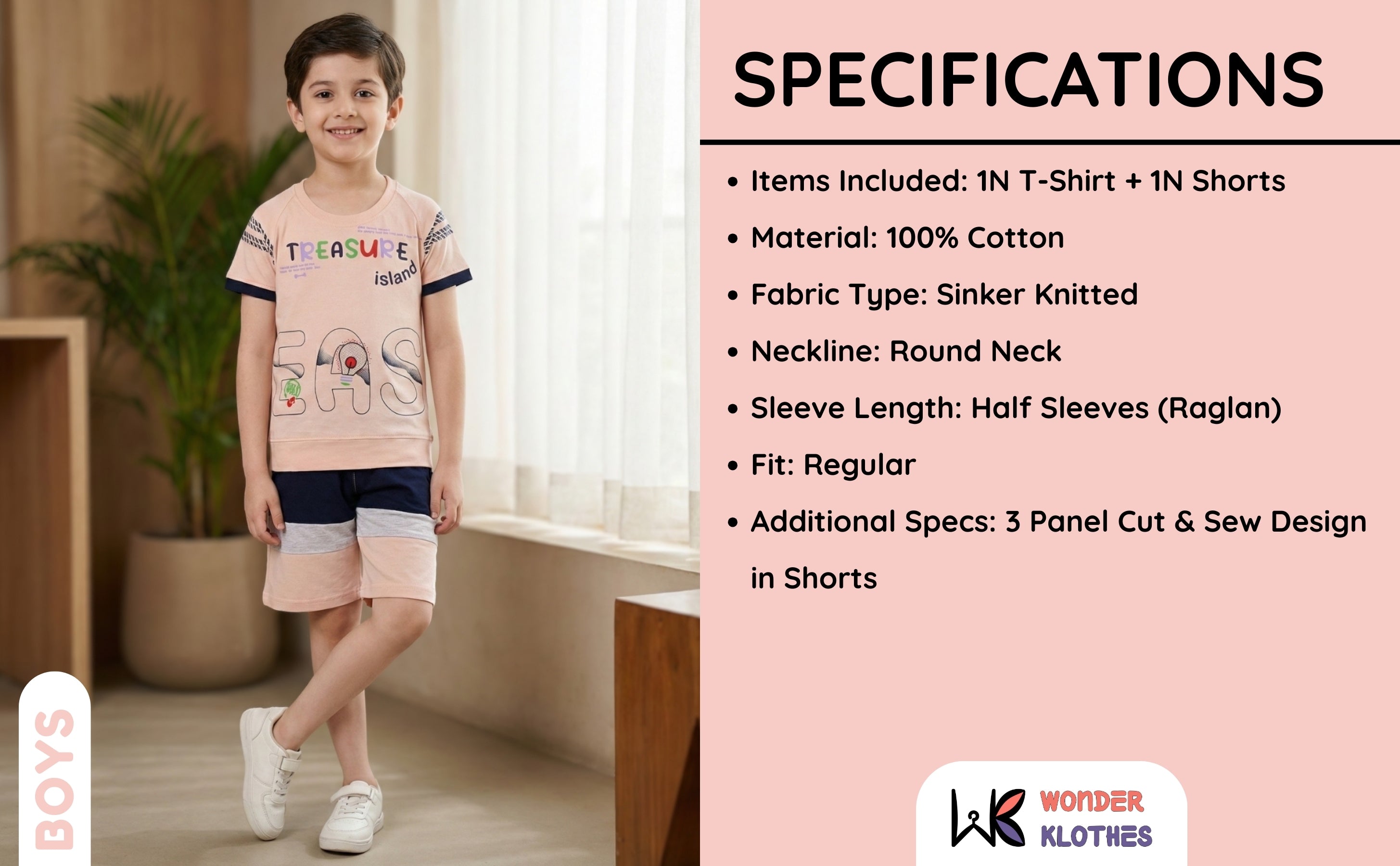 Ahoy, little explorers! Get set for a grand adventure with this fantastic kids t shirt set of boys! Designed for maximum fun, this outfit features a cool print that sparks imagination. Made from premium lightweight 100% Cotton Sinker Fabric, it keeps him cool and comfy while he hunts for hidden gold. It is the ultimate kids dress boys will love to wear all summer long!